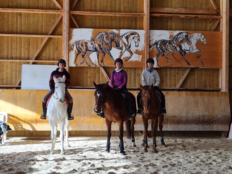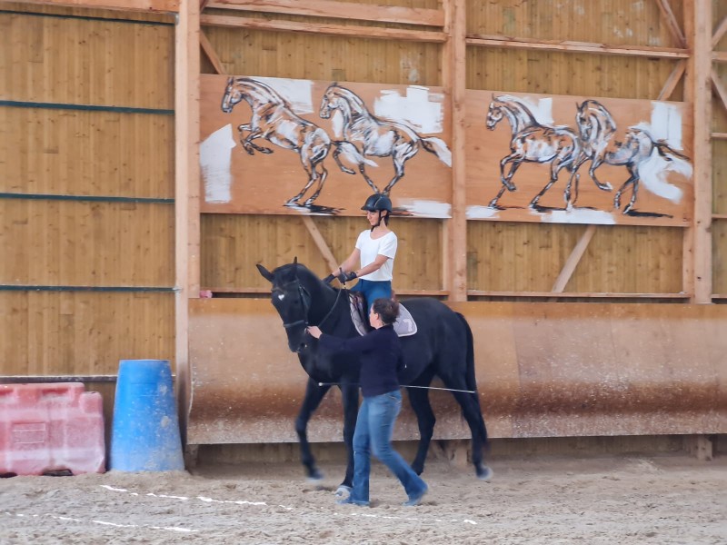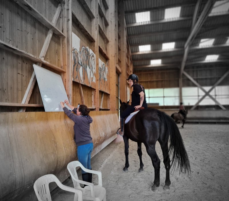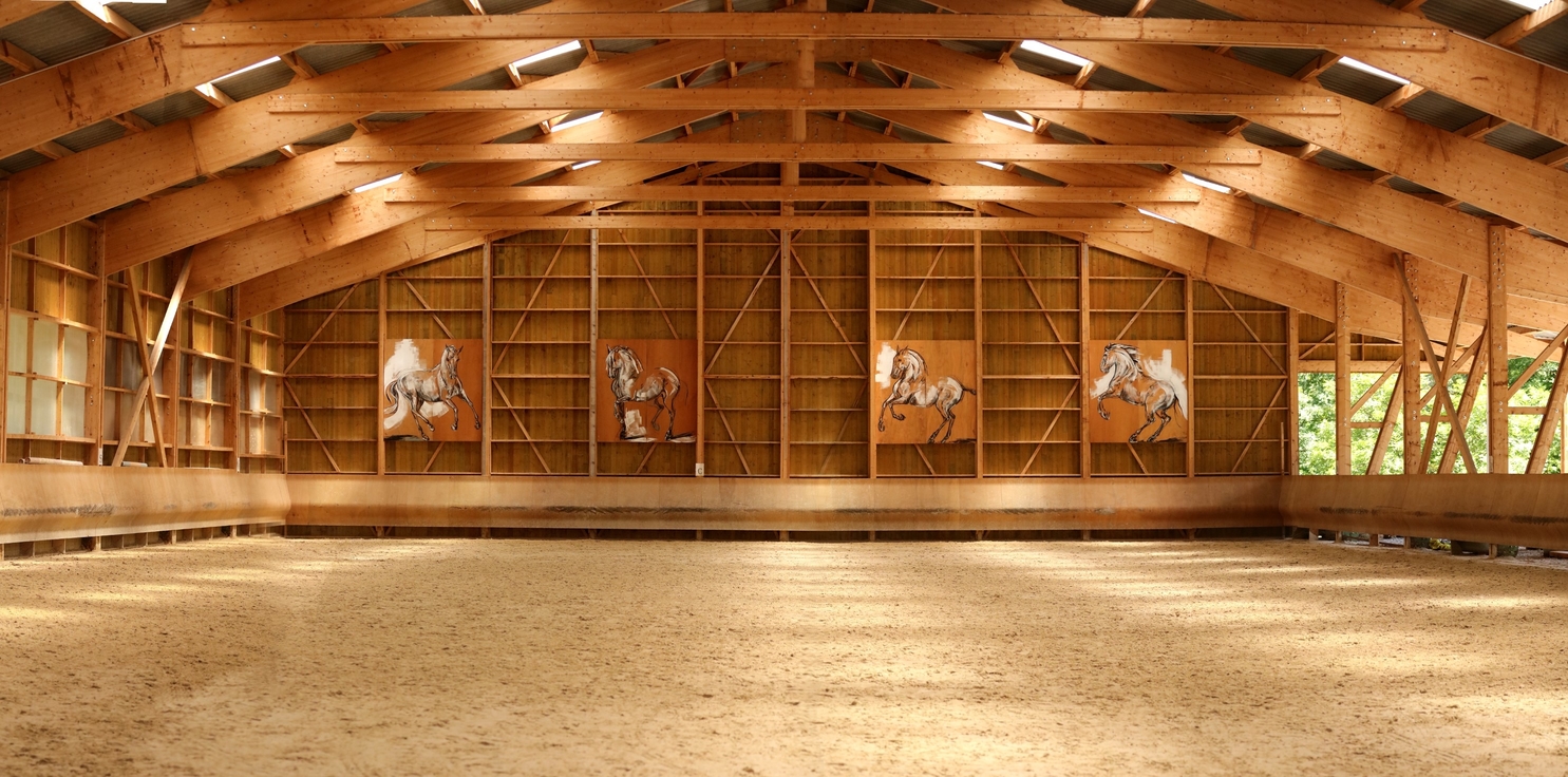Magnifique manège de 50*25 , bénéficiez d’un sol excellent , d’un éclairage naturel plein sud , mais également artificiel aux LED la nuit . La charpente bois ainsi que les magnifiques peintures de Graziella Bordignon en font un très bel espace intérieur pour travailler dans le calme et la sérénité .